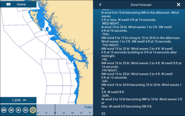 Select a marine zone to view the written NOAA forecast for that region. No need to wait for the VHF radio report.