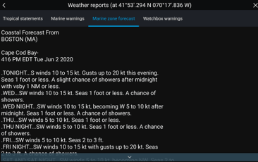 Select a marine zone to view the written NOAA forecast for that region. No need to wait for the VHF radio report.