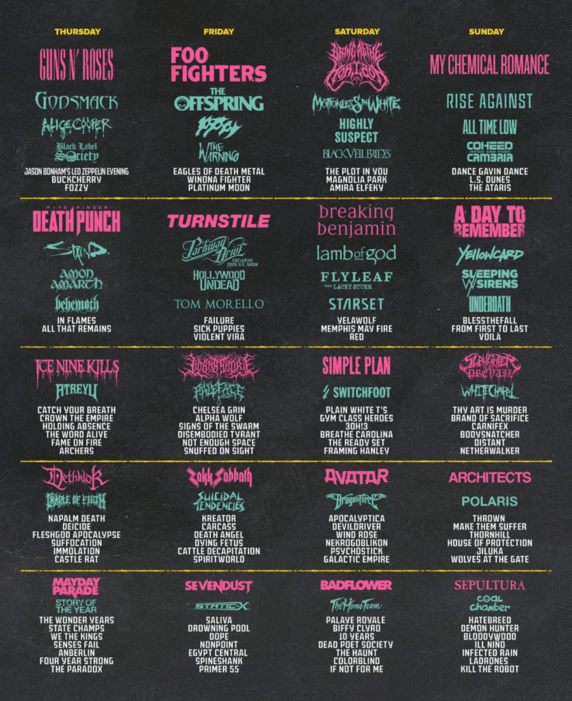 Thursday, May 7: Guns N’ Roses, Five Finger Death Punch, Godsmack, Staind, Alice Cooper, Amon Amarth, Behemoth, Ice Nine Kills, Atreyu, Dethklok, Cradle of Filth, Mayday Parade, and Story of the Year, among other acts.