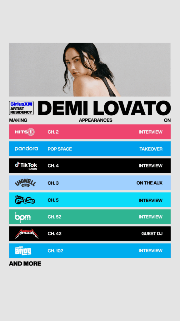 Demi’s residency kicks off with an exclusive interview on SiriusXM Hits 1, followed by more conversations on TikTok Radio, The Pulse, BPM, and Radio Andy.