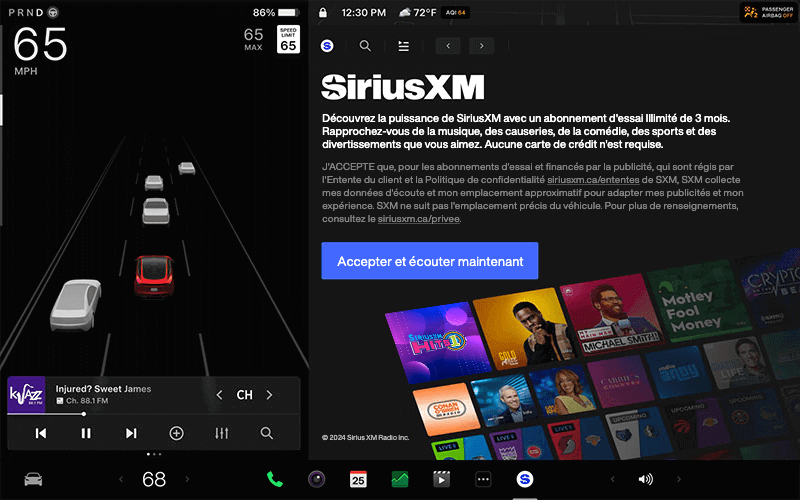 2. Recherche la version d’essai de SiriusXM sur l’écran tactile de ta Tesla et appuie sur « J’accepte et écouter maintenant ».