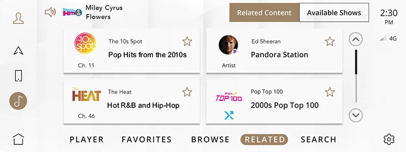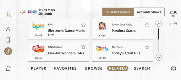 Like what you’re hearing? Tap “Related” on the right of your screen to find other channels and On Demand shows that feature programming similar to what you’re tuned in to at any given moment.