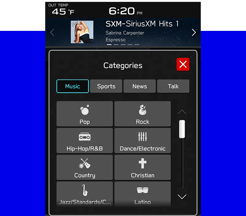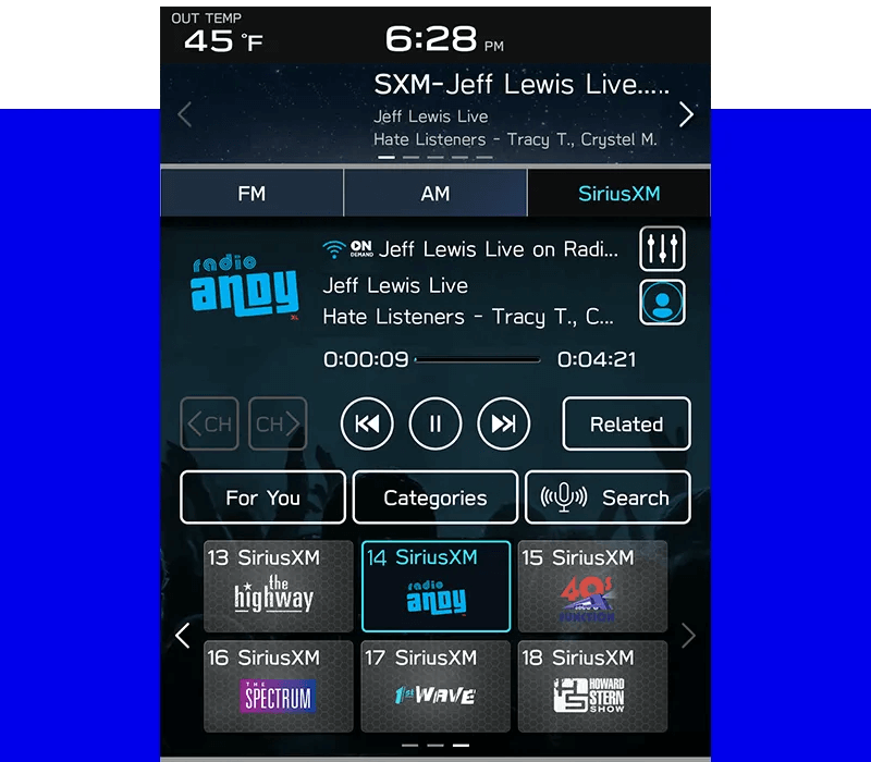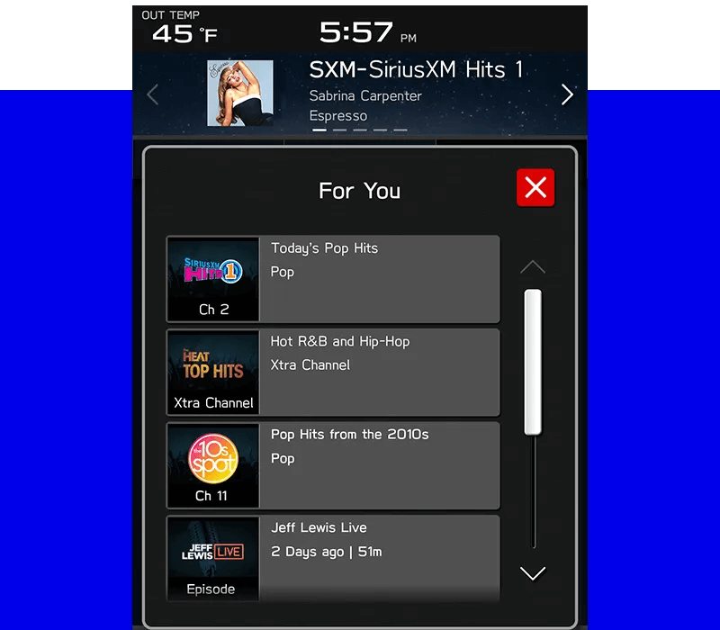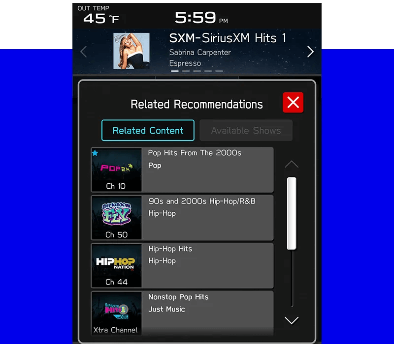 Our advanced in-car technology will guide you to the most SiriusXM channels, shows, and hosts for a ride that’s uniquely you, with personalization features to make discovering your perfect entertainment easier than ever before.